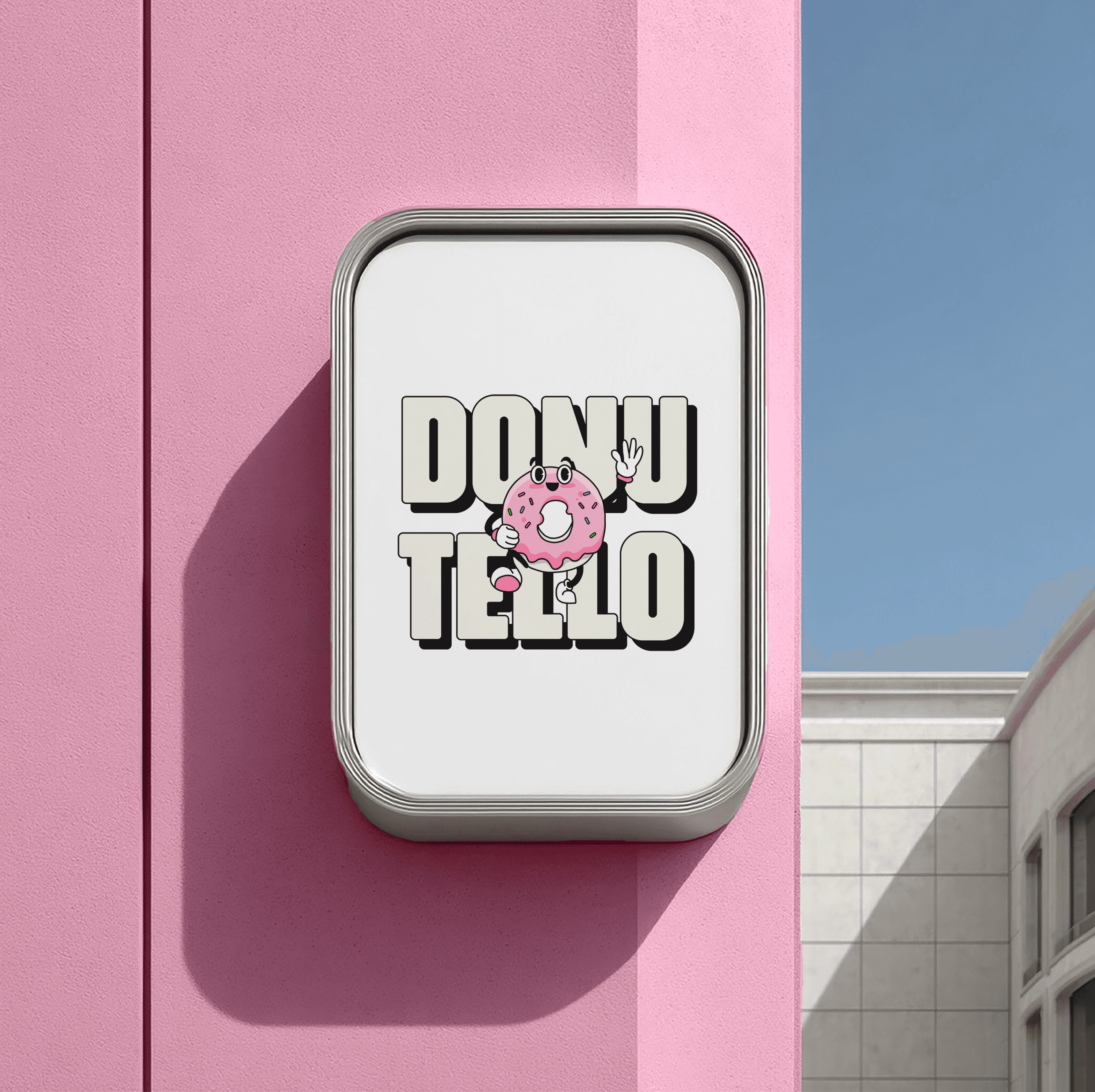 Donutello’s brand identity was created to be playful, inviting, and instantly recognizable. The concept uses a cheerful pink palette, inspired by classic glazed donuts, paired with a friendly cartoon mascot that adds personality and charm. Bold, rounded typography enhances the approachable and fun aesthetic, while checkered patterns bring a nostalgic, diner-style vibe.